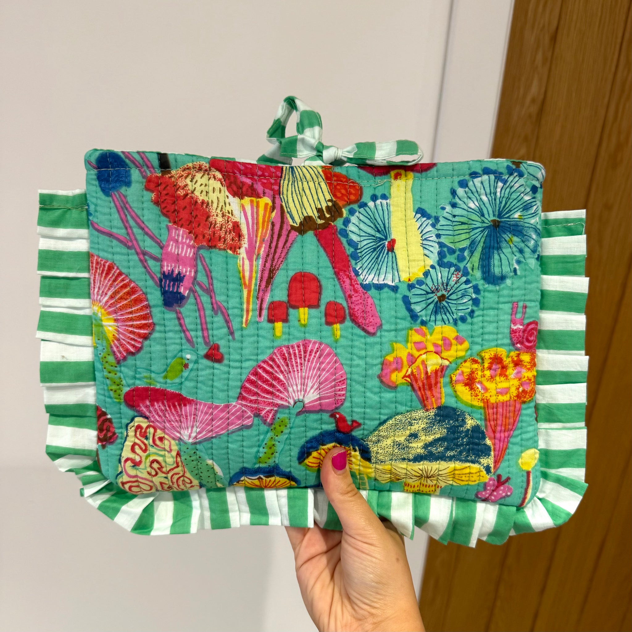 The striped fabric for the ruffle has also been used for the lining inside.